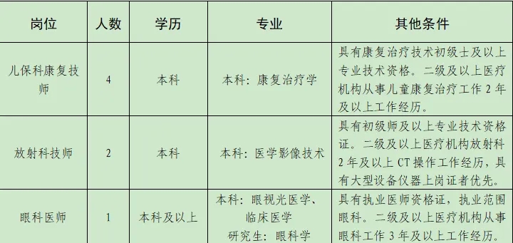 儿保科康复技师4名、放射科技师2名、眼科医师1名。