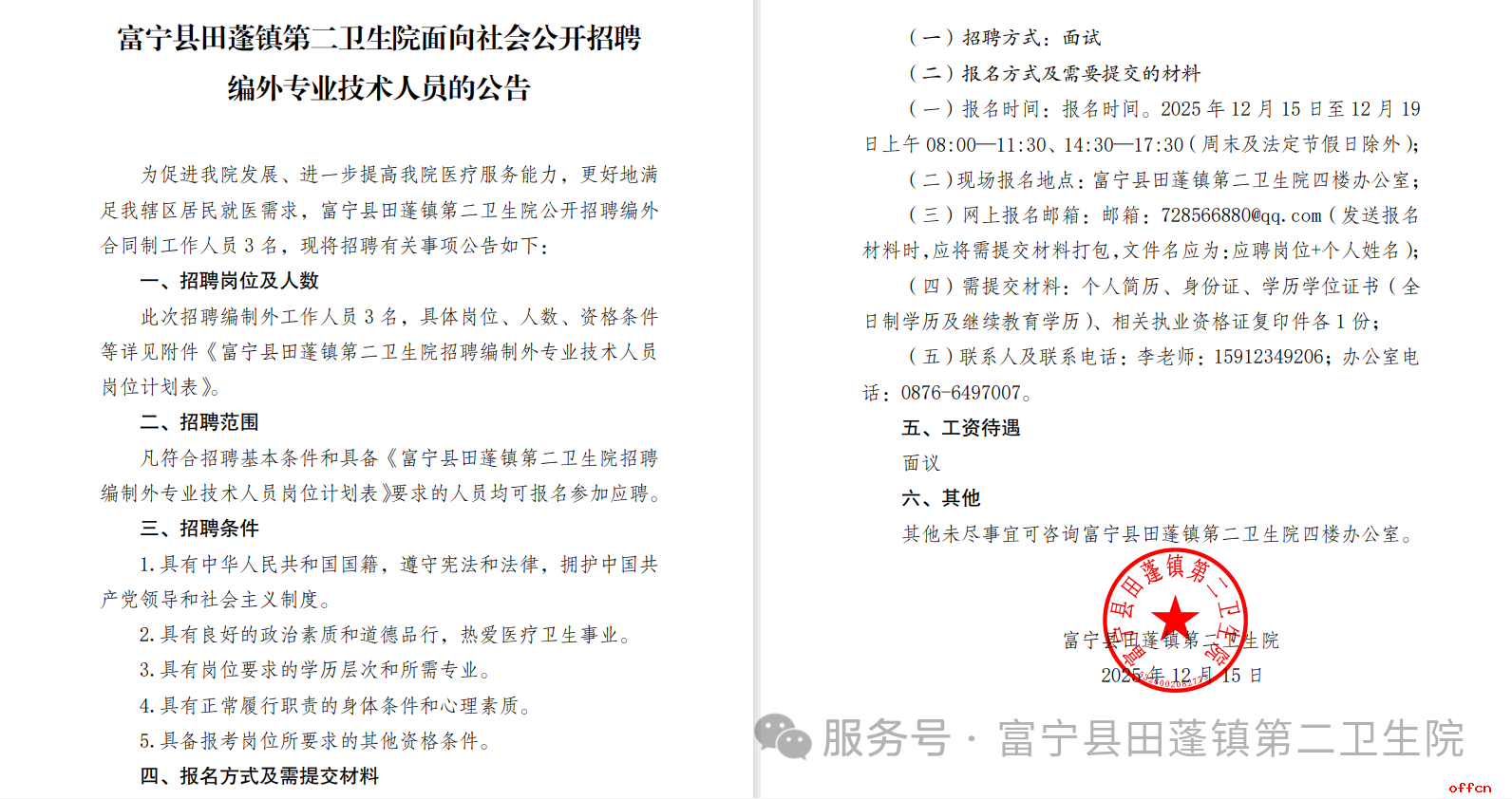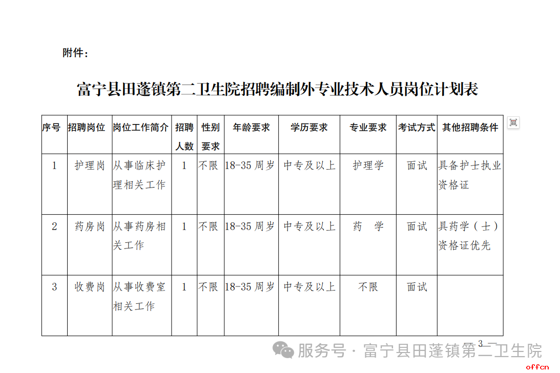 此次招聘编制外工作人员3名,具体岗位、人数、资格条件等详见附件《富宁县田蓬镇第二卫生院招聘编制外专业技术人员岗位计划表》。