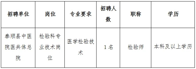 泰顺县中医院医共体总院因工作需要,需向社会招聘医学检验技术专业技术工作人员1名。