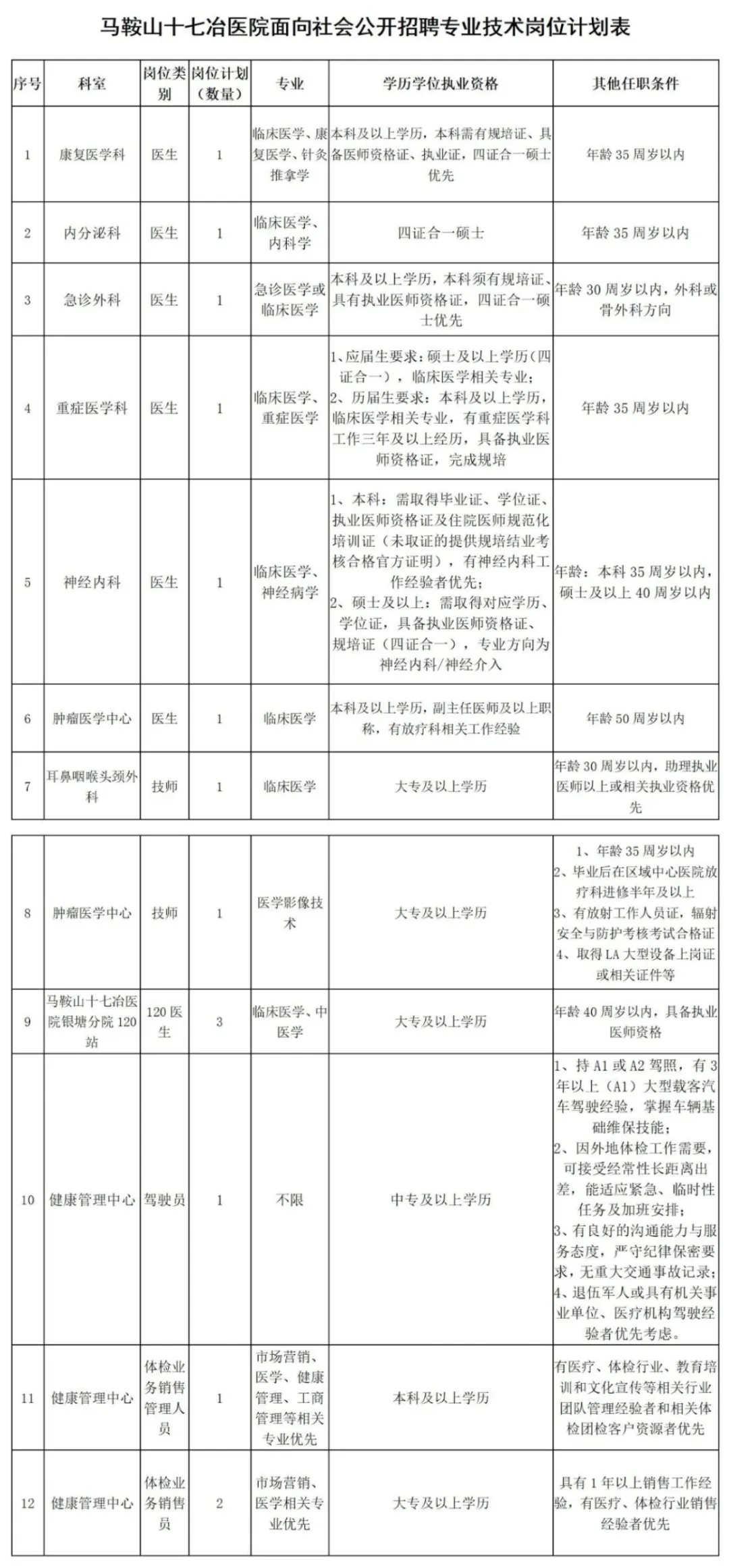 2025年马鞍山十七冶医院招聘15人公告已发布,医药人才网为大家收集整理事业单位卫生系统招聘信息,提供相关备考电子版资料和辅导课程。更多卫生人才招聘信息,可点击安徽卫生人才招聘栏目。