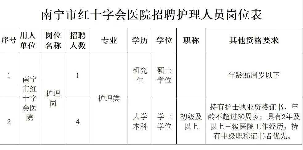 2025广西南宁市红十字会医院招聘护理人员5人公告已发布,医药人才网为大家收集整理事业单位卫生系统招聘信息,提供相关备考电子版资料和辅导课程。更多卫生人才招聘信息,可点击广西卫生人才招聘栏目。