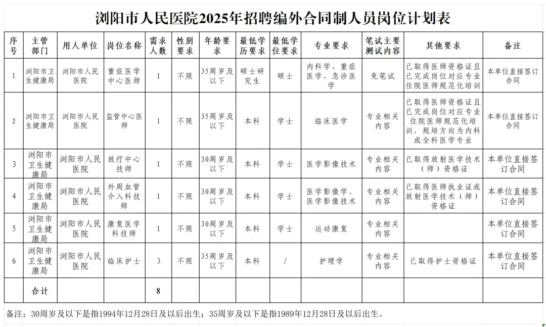 因工作需要,根据《浏阳市机关事业单位编外合同制人员管理办法》(浏编委发〔2021〕67号)文件精神,浏阳市人民医院决定面向社会公开招聘编外合同制工作人员8名,现就有关事项公告如下:
