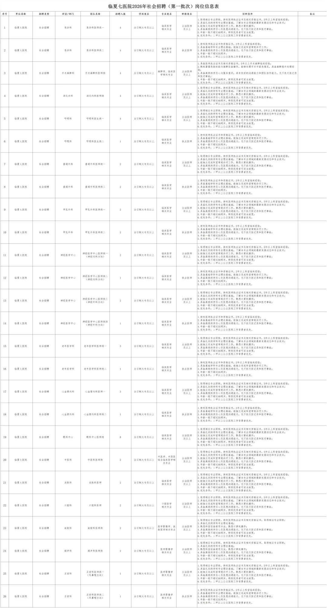 根据工作需要,计划公开招聘医师岗位63人。岗位信息及具体要求详见附件一《临夏七医院2026年社会招聘(第一批次)岗位信息表》。
