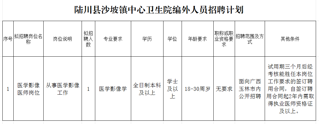 2026广西玉林市陆川县沙坡镇中心卫生院招聘编外工作人员1人公告已发布,医药人才网为大家收集整理事业单位卫生系统招聘信息,提供相关备考电子版资料和辅导课程。更多卫生人才招聘信息,可点击广西卫生人才招聘栏目。