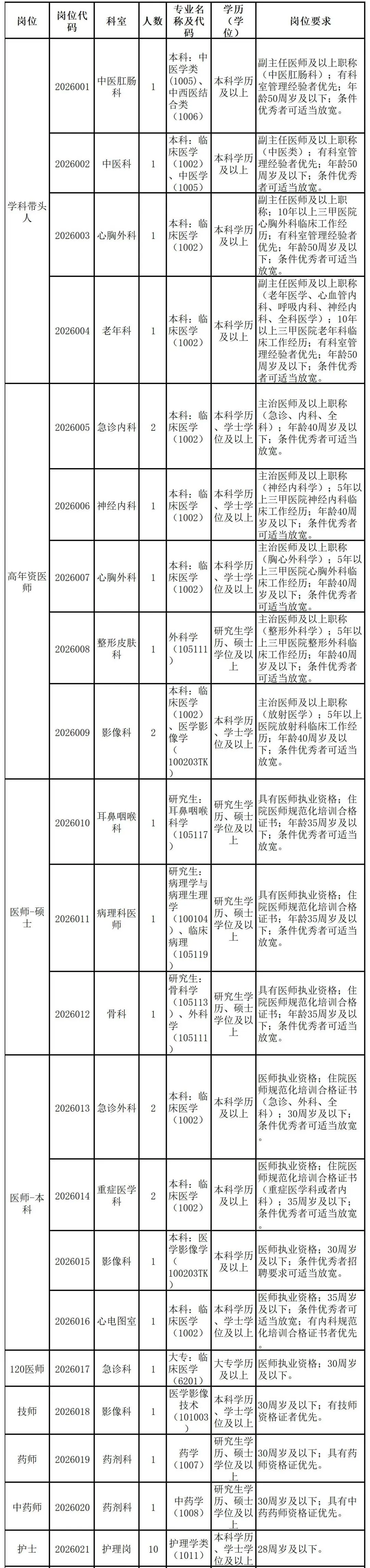 备注:本院长期面向社会引进博士研究生及紧缺专业卫生技术人才(含学科带头人、高级职称人员、硕士研究生),上述人才引进不受招聘岗位职数限制。