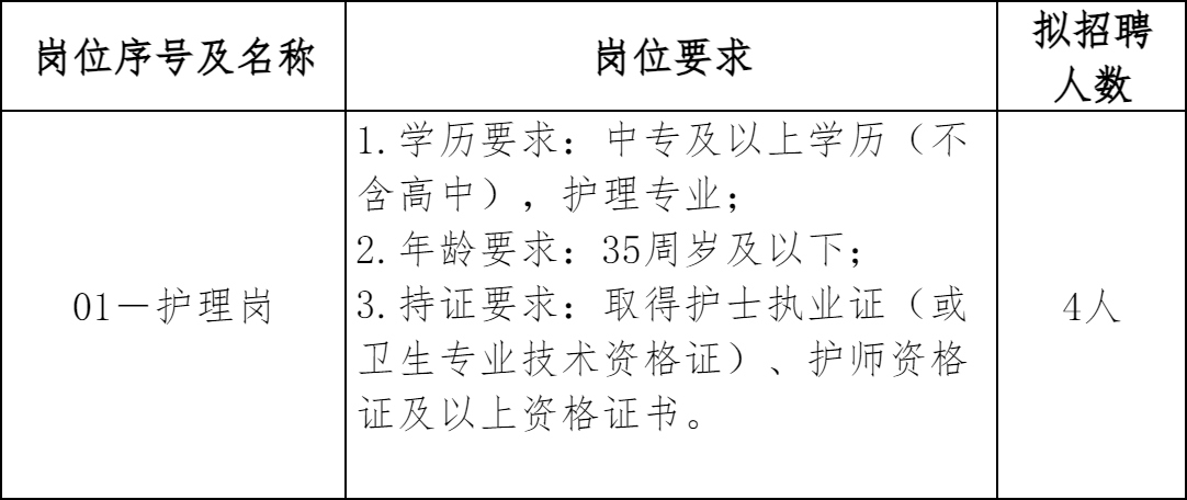 详见附件1《2026年井冈山市第二人民医院招聘岗位及任职要求》。本次招考年龄计算方法为:35周岁及以下是指1991年1月9日(含)以后出生。招聘岗位要求的学历、工作经历的计算截止时间为2026年1月9日(含),毕业证书或资格证书获取的时间截至2026年1月9日(含)。