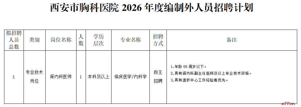 根据我院发展需要,本次招聘均为编制外招聘,招聘1名编制外聘用人员。具体招聘专业岗位及数量要求见《西安市胸科医院2026年度编制外人员招聘计划》。