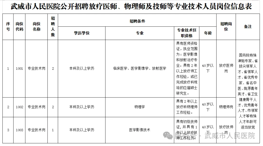 详见《武威市人民医院公开招聘放疗医师、物理师及技师等专业技术人员岗位信息表》