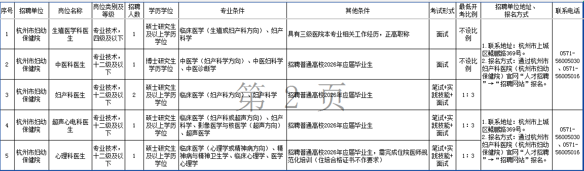 其中,杭州市妇幼保健院心理科医生岗位(序号5)须提供规范化培训单位有关是否完成住院医师规范化培训的证明。