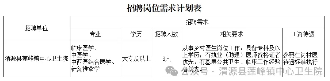 (2)年龄男性在45周岁(含45周岁)以下、女性在40周岁(含40周岁)以下,身体健康,医学相关专业,全日制大专及以上学历(拥有基层公共卫生或临床工作经验者、持有执业(助理)医师资格证者可以适当放宽条件,熟悉莲峰镇各村情况者优先)。