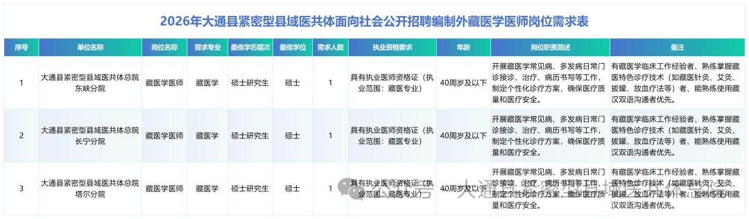 为进一步加强大通县紧密型县域医共体总院卫生人才队伍建设,满足各分院临床工作需要,经研究面向社会公开招聘藏医学岗位医师3名。现将有关事项公告如下:一
