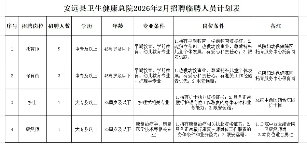 2026安远县卫生健康总院招聘临聘人员10人公告已发布,医药人才网为大家收集整理事业单位卫生系统招聘信息,提供相关备考电子版资料和辅导课程。更多卫生人才招聘信息,可点击江西卫生人才招聘栏目。