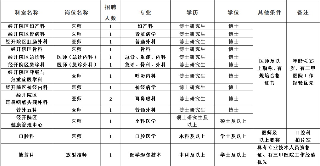 以上学历要求博士研究生的岗位如未招满,可放宽至具有三级甲等医院工作经历的优秀硕士研究生。