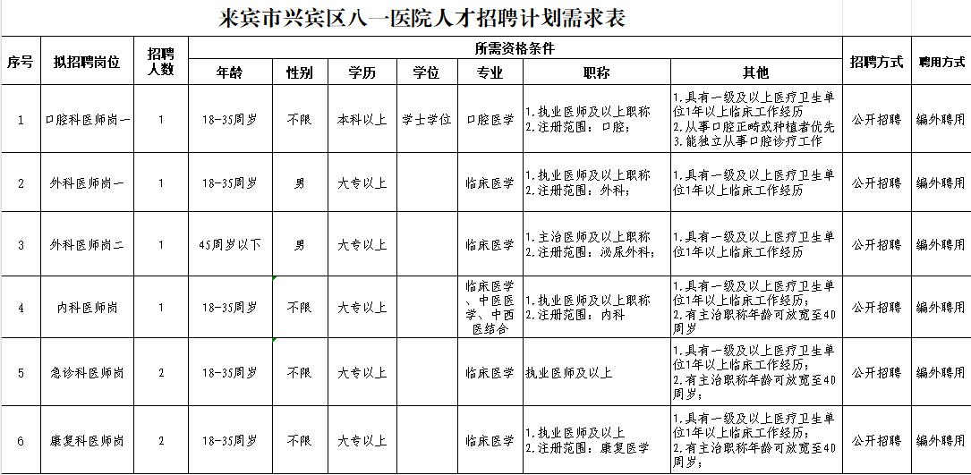 2026广西来宾市兴宾区八一医院公开招聘医师8人公告已发布,医药人才网为大家收集整理事业单位卫生系统招聘信息,提供相关备考电子版资料和辅导课程。更多卫生人才招聘信息,可点击广西卫生人才招聘栏目。