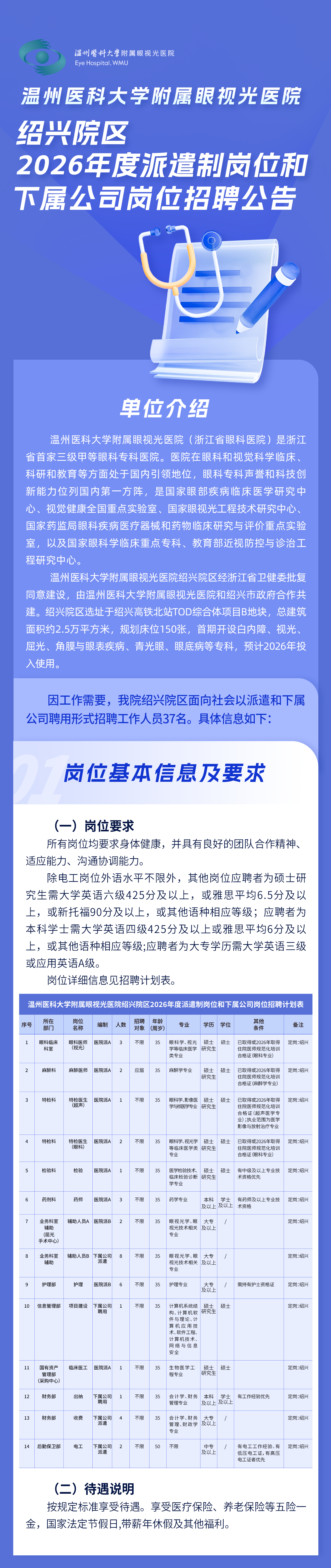 2026年温州医科大学附属眼视光医院绍兴院区招聘派遣制岗位和下属公司岗位37人公告已发布,医药人才网为大家收集整理事业单位卫生系统招聘信息,提供相关备考电子版资料和辅导课程。更多卫生人才招聘信息,可点击浙江卫生人才招聘栏目。