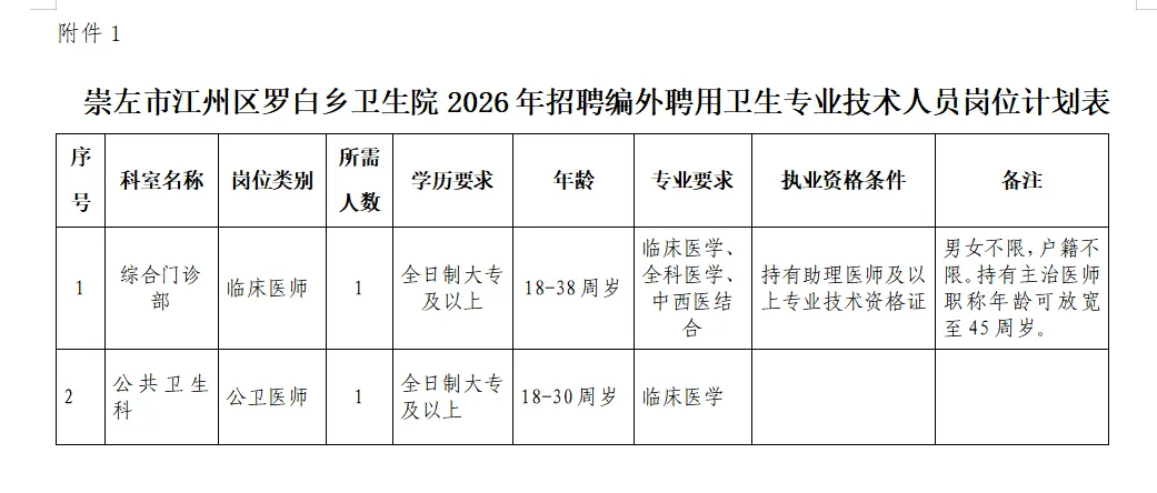 2026广西崇左市江州区罗白乡卫生院招聘2人公告已发布,医药人才网为大家收集整理事业单位卫生系统招聘信息,提供相关备考电子版资料和辅导课程。更多卫生人才招聘信息,可点击广西卫生人才招聘栏目。