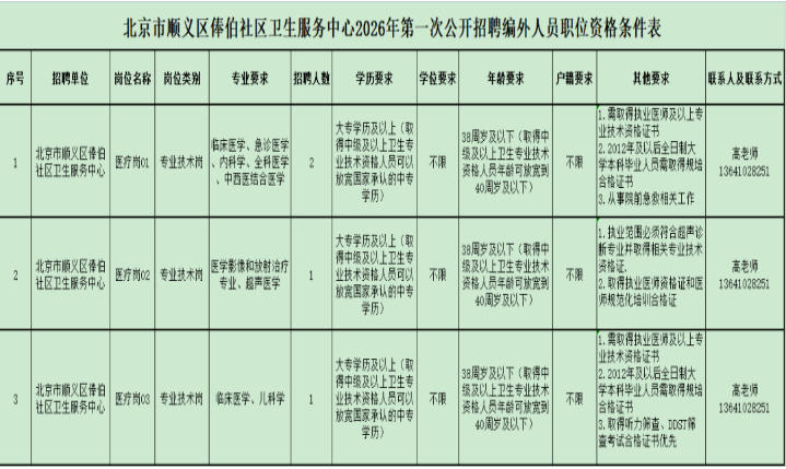 俸伯社区卫生服务中心位于顺义区南彩镇后俸伯村东,是一所集基本医疗和公共卫生服务为一体的现代化综合性乡镇卫生院。结合目前中心业务发展和人才队伍建设需要,现对外公开招聘2026年度编外人员,具体招聘细则如下: