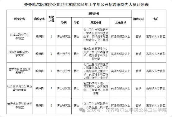 2026年上半年齐齐哈尔医学院公共卫生学院公开招聘10名编制内工作人员公告已发布,医药人才网为大家收集整理事业单位卫生系统招聘信息,提供相关备考电子版资料和辅导课程。更多卫生人才招聘信息,可点击黑龙江卫生人才招聘栏目。