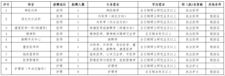 2.学历要求:临床、医技岗位要求本科须为高中毕业学历起点就读的全日制本科,硕士研究生的本科学历也须为高中毕业学历起点就读的全日制本科;护理岗位学历要求为全日制本科及以上。