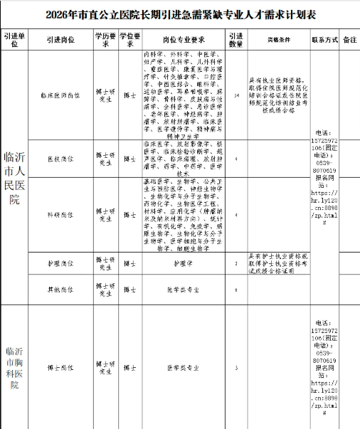 根据工作需要,计划引进急需紧缺专业人才53名,引进岗位和计划及具体要求详见《2026年市直公立医院长期引进急需紧缺专业人才需求计划表》。