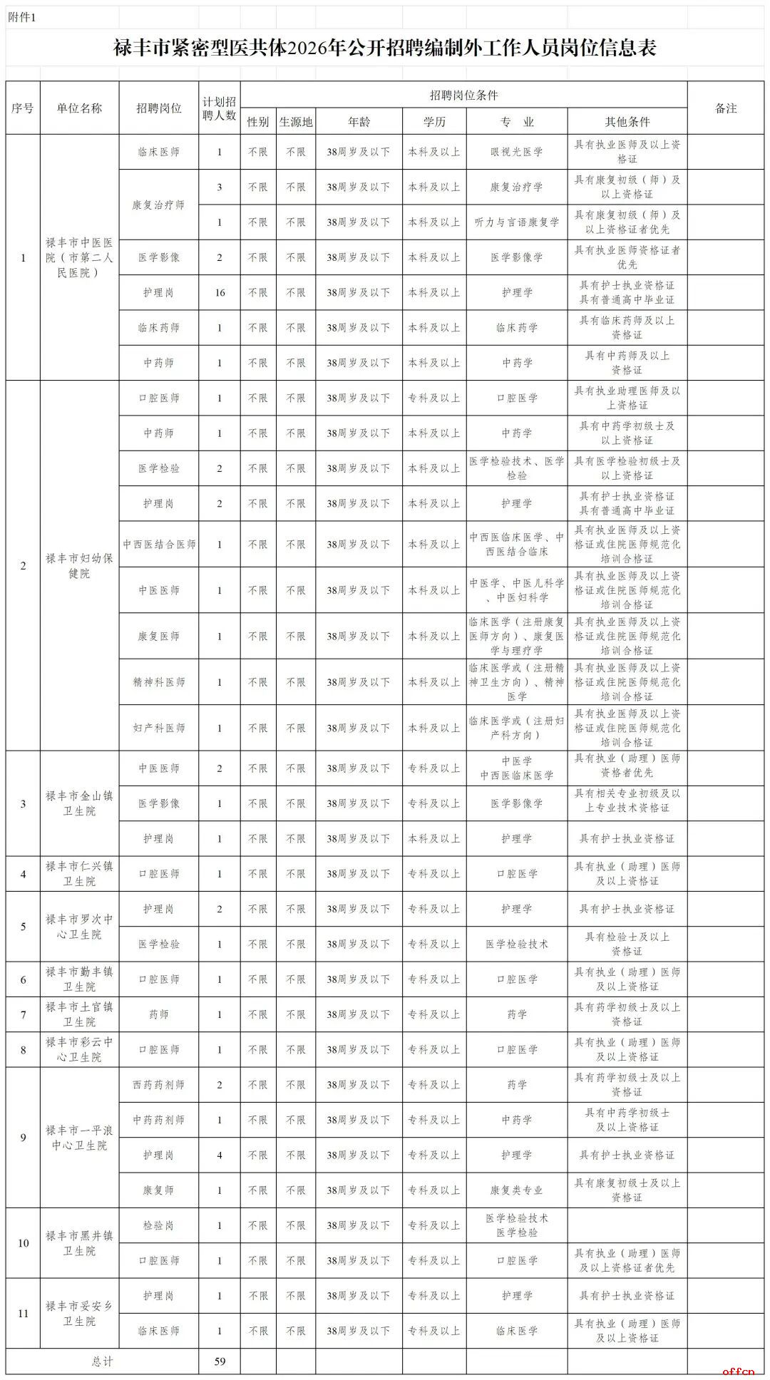 招聘的具体岗位、人数、资格条件等详见岗位信息表《禄丰市紧密型医共体2026年公开招聘编制外工作人员岗位信息表》(附件1)。