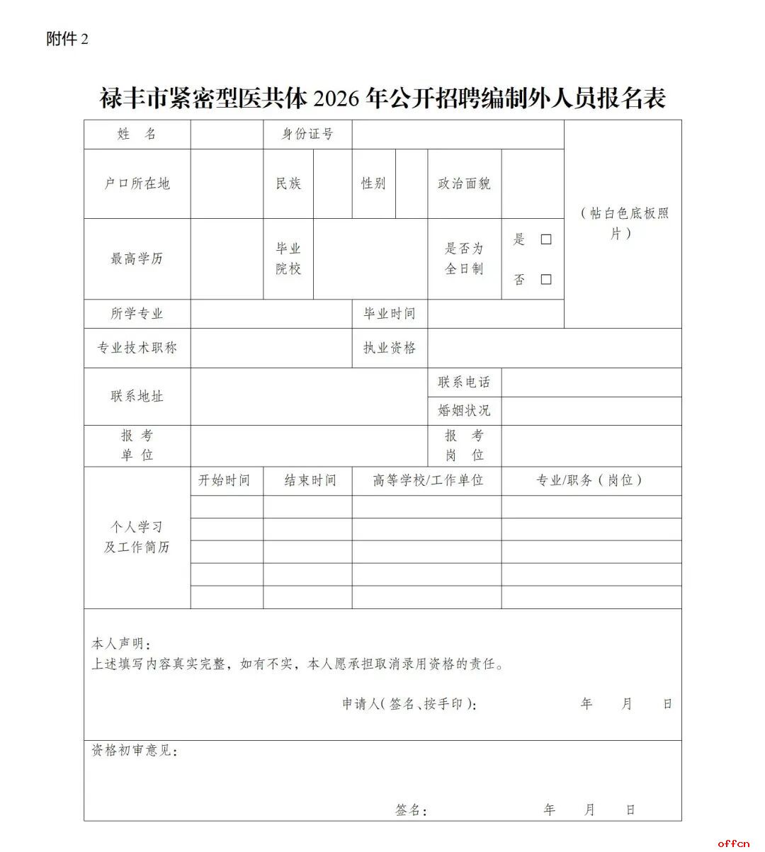 2. 禄丰市紧密型医共体2026年公开招聘编制外工作人员报名表