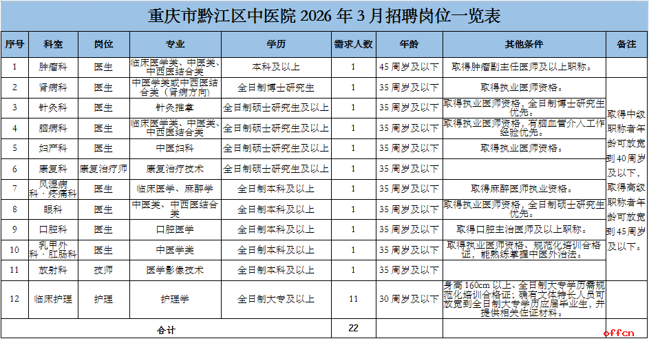 本次招聘工作人员共11个岗位,22人,具体招聘岗位及数量详见附件《重庆市黔江区中医院2026年3月招聘岗位一览表》。