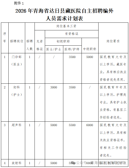 本次招聘编外专业技术及后勤人员7名,具体招聘要求详见附件1《2026年青海省达日县藏医院自主招聘编外人员需求计划表》(以下简称《计划表》)。