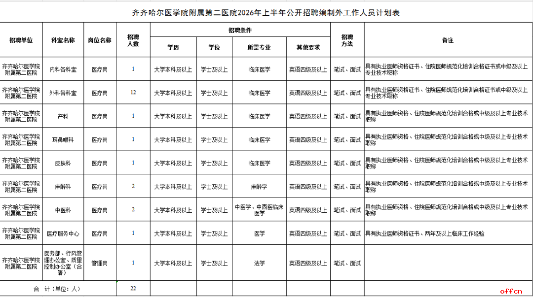 本次计划招聘事业单位工作人员22名,详见《齐齐哈尔医学院附属第二医院2026年上半年公开招聘编制外工作人员计划表》(附表)。