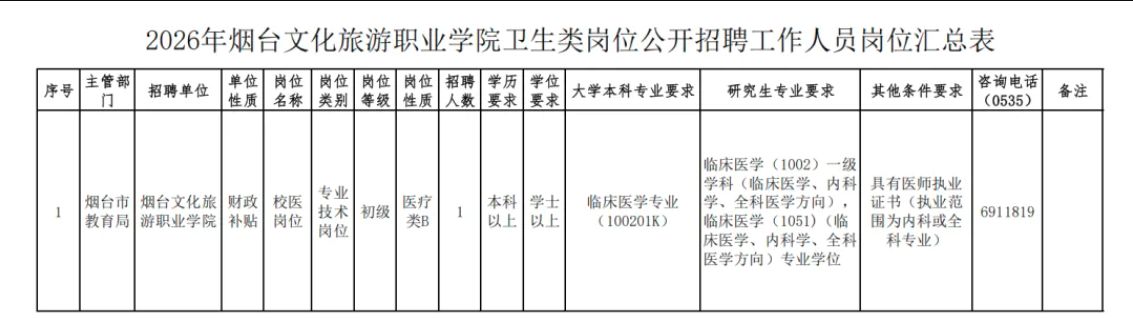 烟台文化旅游职业学院卫生类岗位公开招聘工作人员的岗位条件、招聘人数等具体要求见《2026年烟台文化旅游职业学院卫生类岗位公开招聘工作人员岗位汇总表》(附件2)。