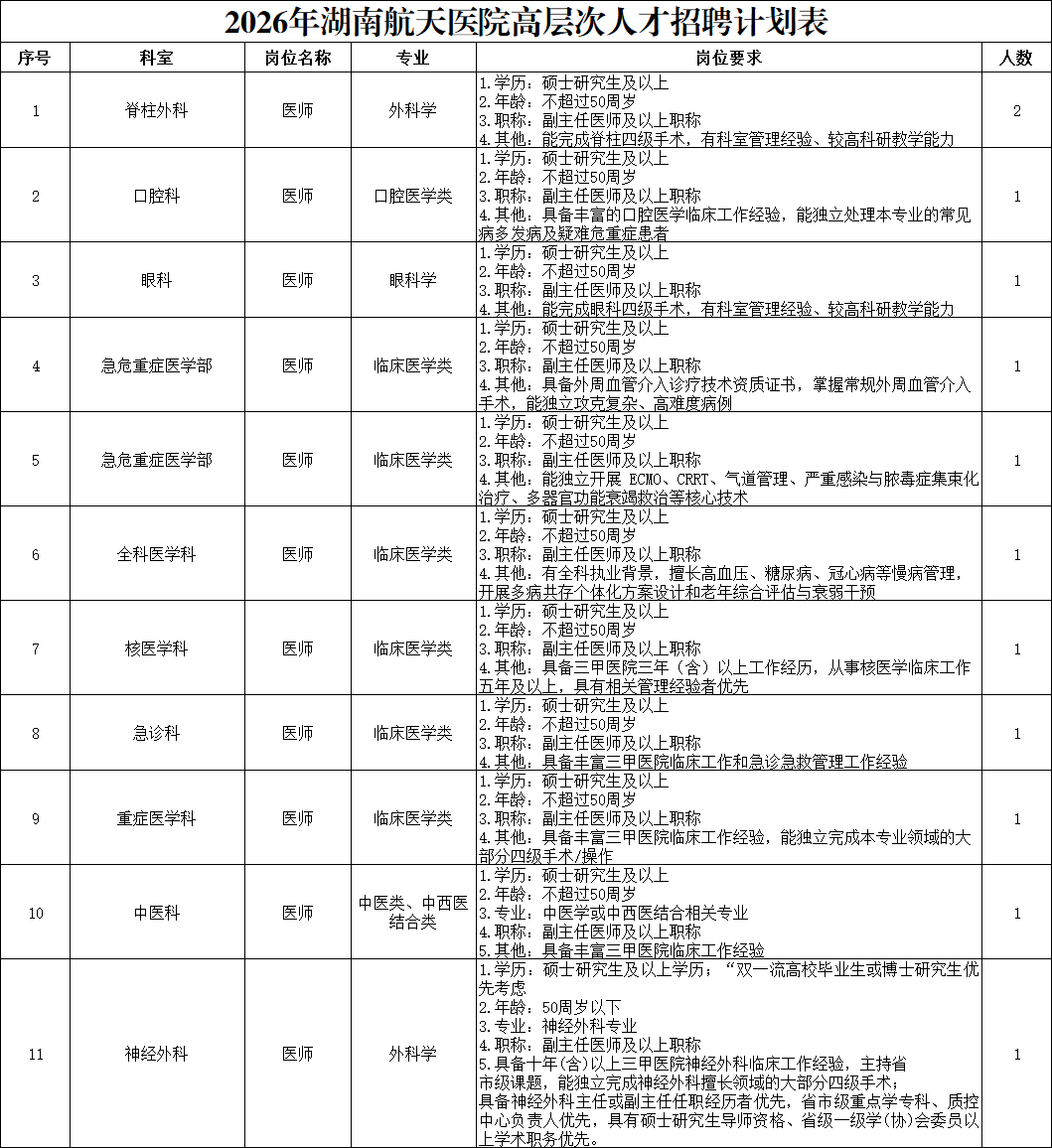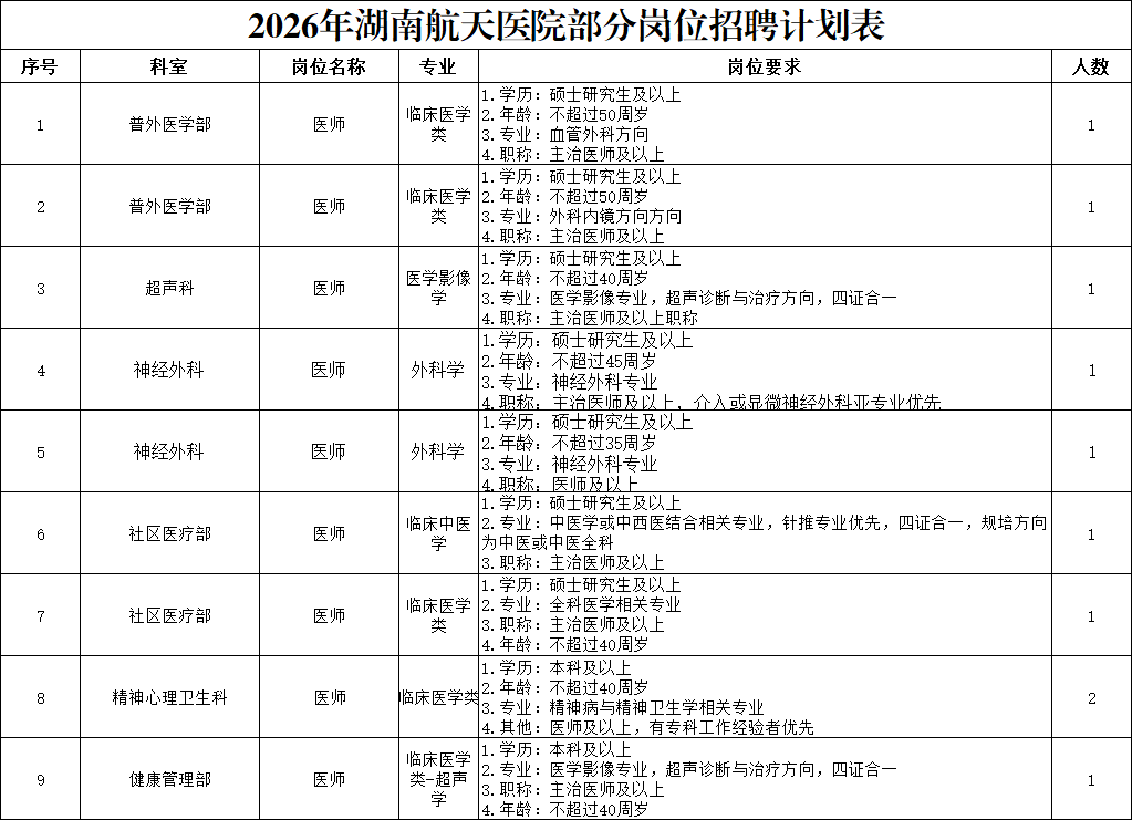 2026年湖南航天医院部分岗位招聘计划表