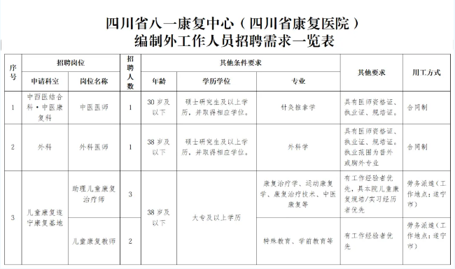 四川省八一康复中心(四川省康复医院)2026年公开招聘工作人员(编制外)公告已发布,医药人才网为大家收集整理事业单位卫生系统招聘信息,提供相关备考电子版资料和辅导课程。更多卫生人才招聘信息,可点击四川卫生人才招聘栏目。