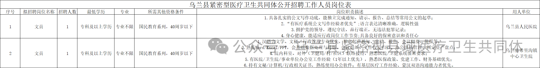 附件:《乌兰县紧密型县域医疗卫生共同体公开招聘工作人员岗位表》