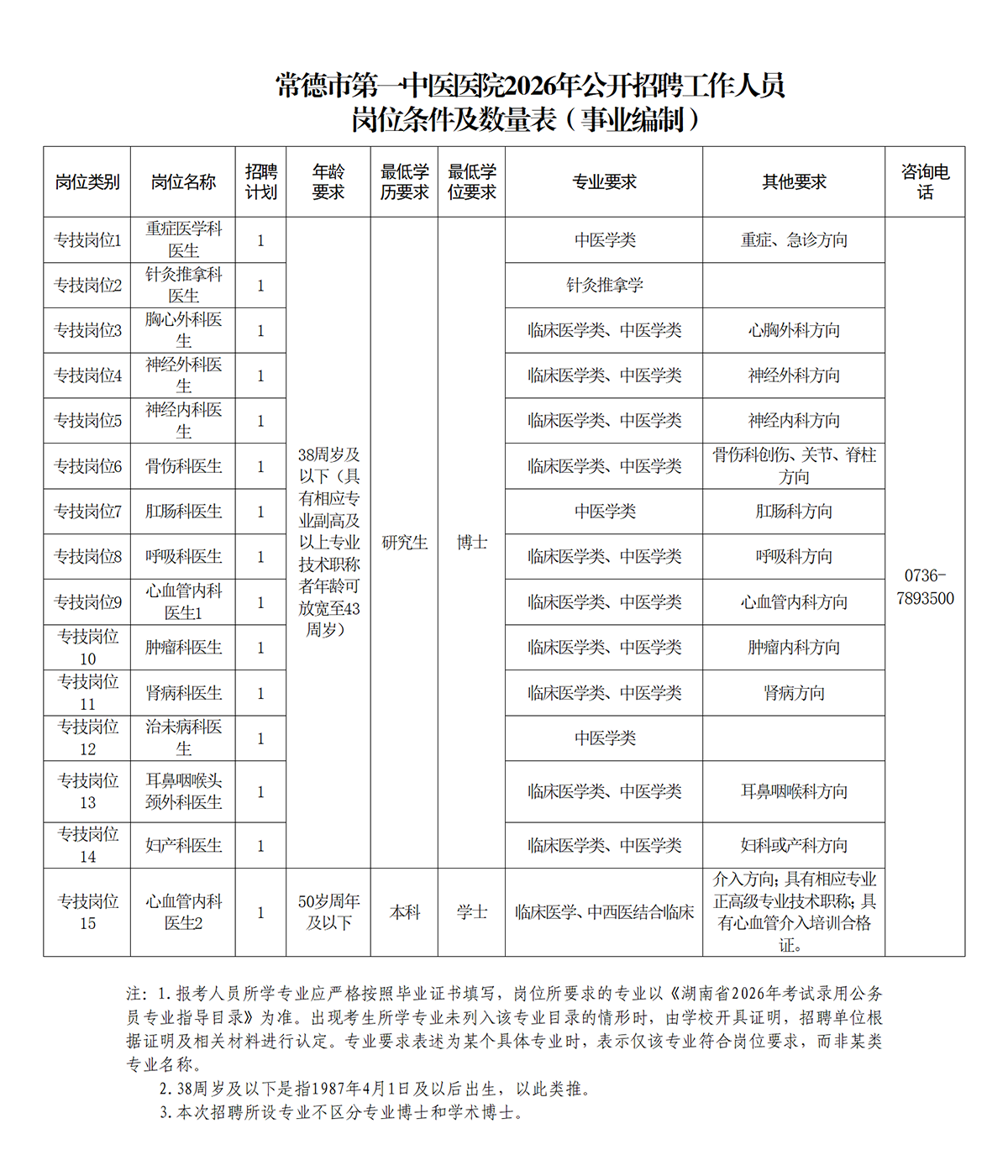 附件1:常德市第一中医医院2026年公开招聘工作人员岗位条件及数量表(事业编制)