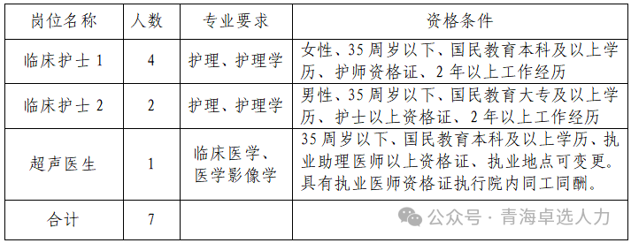 为满足高质量发展需要,进一步优化公共卫生资源配置,持续充实医疗和护理人才队伍,西宁市湟中区第二人民医院现面向社会公开招聘编外工作人员7名。现将招聘相关事宜公告如下:一、招聘岗位及需求