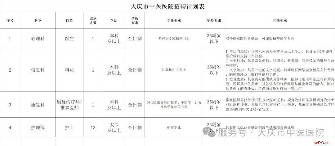 因工作需要,现大庆市中医医院拟招聘工作人员,具体要求如下:用工形式