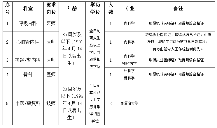 3.医师岗位入职时应取得学历学位证书、医师资格证、医师执业证、规培合格证书(尚未取得的应提供规培证明)。