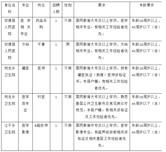 为进一步推进深化医药卫生体制改革,切实加强医疗卫生人才队伍建设,根据我县域医共体成员单位医务人员总量配备管理办法及工作实际需要,现面向全省公开招聘甘德县域医共体总院编外专业技术人员5人,现将有关事项公告如下:一、招聘岗位