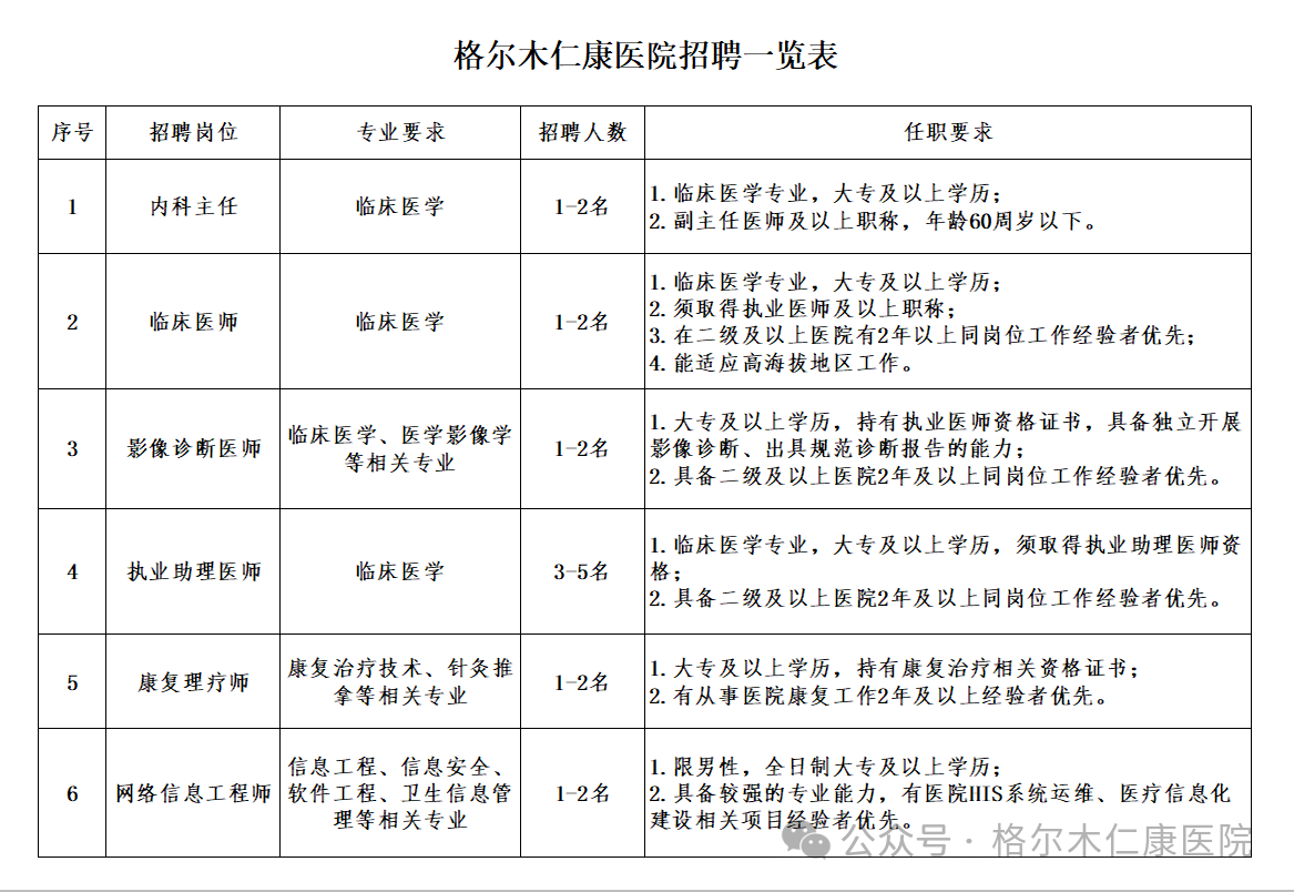 本次招聘面向社会公开进行,具体岗位及要求详见《格尔木仁康医院招聘岗位一览表》