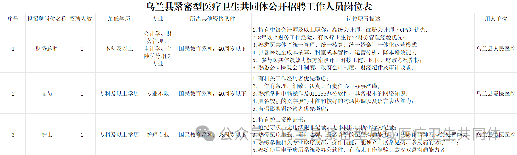 本次招聘由乌兰县紧密型县域医疗卫生共同体办公室进行统一招聘,招聘后人员按照《乌兰县紧密型县域医疗卫生共同体公开招聘工作人员岗位表》(以下简称《岗位表》进行分配,招聘岗位、人数和相关要求详见《岗位表》。