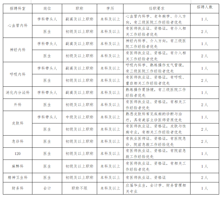 根据医院发展需要,现面向社会公开招聘以下岗位人员,有关事项公告如下: