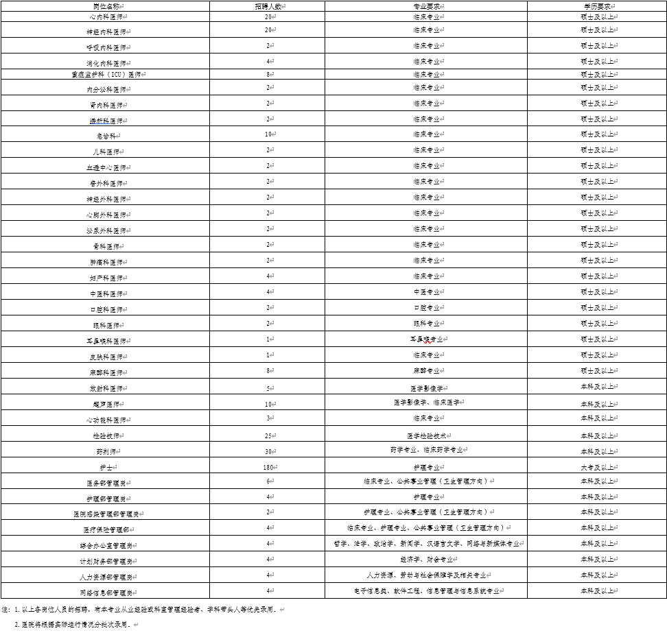 4.原则上医师序列要求硕士及以上学历;护理序列优秀的可放宽至大学专科学历;其余序列要求大学本科及以上学历。