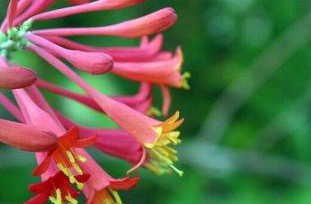 我们的忍冬植物最高可长到九米,每当夏季,它就会开出艳红色的花朵。花冠类似唇形。果子成熟之后由红色转成黑色,掉落在地。