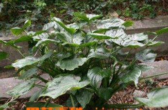 姑婆芋是一种来自南美洲的植物,别名观音莲、海芋、滴水观音。该植物适合在阴湿的环境中生长。其形态特征是根部硕大、叶子卵形、花色多见黄白,果子深红。
