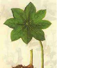 【原形态】多年生草本。根茎横卧,具粗壮的须状根。茎直立,高约20~40厘米。茎生叶2片,在近茎顶处相接而生;柄长14厘米左右;叶片盾状亚圆形,直径20~30厘米,5~9浅裂,裂片广三角状卵形,长3~5厘米,叶缘有细齿。伞形花序,生于茎顶两叶交叉处,花5~8,或更多,下垂;萼片6,椭圆形,长约12毫米;花瓣6,暗红色,2轮排列,外轮3枚椭圆形,内轮3枚倒卵形;雄蕊6,花丝扁平,开张;花药与花丝等长或较长,内向;花柱短,柱头盾状,子房上位。浆果圆形。花期初夏。