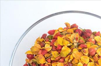 合欢花:干燥花序呈团块状,有如棉絮。小花长约0.8~1厘米,弯曲,淡黄褐色或绿黄色;花冠筒状,先端5裂,外面有长柔毛;花萼细筒状,绿黄色;雄蕊多数,花丝细长,伸出花冠外,交织紊乱,易断。微香。