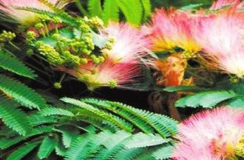 夜合枝头别有春,坐含风露入清晨,任他明月能想照,敛尽芳心不向人。这是对合欢花的美赞。合欢花叶似含羞草,花如锦绣团,一树绿叶红花有似含羞的少女绽开的红唇,又如腼腆少女羞出之红晕。被定为澳大利亚国花的合欢花象征永远恩爱、两两相对,是夫妻好合的象征。