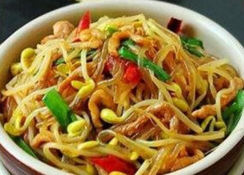 白粉条和黄豆芽搭配在一起炒特别好吃,再做的时候需要把粉条泡软,切成段黄豆芽洗净,再准备适量的肉丝在炒锅中放适量食用油,放入几个红辣椒炒香,把肉丝入锅炒到变色黄豆芽入锅炒软,再把粉条入锅快速翻炒,放入适量生抽和蚝油,加少量食用盐调味,炒好以后直接出锅就可以。