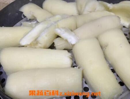 1、平时煮制木薯时,可以把它连皮一起煮制,但是要用刀把它外层的老皮削一下,直接放在锅中加清水煮至煮到它表面开裂以后,取出外皮剥掉,切成自己喜欢的块状。