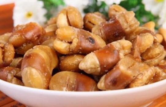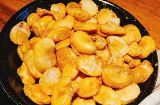 3、把泡好以后的蚕豆取出放在通风的地方摊晾一天,把它表面的水分全部控干,然后再把它放入到冰箱的冷冻室冷冻2~3小时,然后在锅中放油,直接把处理好的蚕豆入锅,快速翻炒,油的数量最好要多一些,等锅中的蚕豆开花并变得香脆以后取出沥油,降温以后就是好吃的荷花豆。